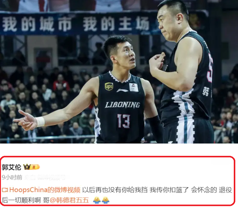 就在舆论对辽宁队的 “冷漠” 议论纷纷时,一则来自 “外人” 的祝福打破了僵局 —— 去年夏天离开辽宁、加盟广州队的郭艾伦,在得知韩德君退役后,第一时间在个人微博发文:“以后,再也没有你给我挡,我传你扣篮了!会怀念的,退役后一切顺利,哥!” 简单的一句话,瞬间勾起无数球迷对 “郭韩组合” 的青春记忆。曾几何时,郭艾伦的犀利突破与韩德君的篮下终结,是辽宁男篮最具杀伤力的进攻套路,两人在球场上的默契配合,以及场下的兄弟情谊,早已成为 CBA 赛场上的一段佳话。即便如今分属不同球队,郭艾伦仍不忘昔日情分,这份 “跨队祝福”,更显珍贵。